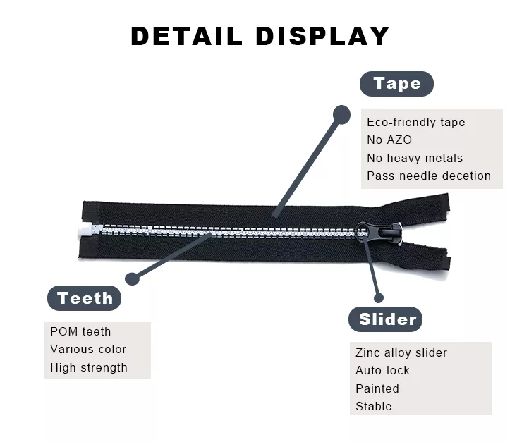 TRC:n ympäristöystävällinen kierrätysmuovivetoketju on valmistettu kierrätetystä muovista, mikä mullistaa modernin suunnittelun yhdistämällä kestävyyden, erinomaisen suorituskyvyn ja innovatiiviset konseptit. Tämä kierrätetystä muovista ja kierrätetystä polyesterinauhasta valmistettu vetoketju säilyttää saman sileyden ja vetolujuuden kuin perinteiset muovivetoketjut ja vähentää merkittävästi tuotantojätteitä ja ympäristövaikutuksia. Nämä ominaisuudet tekevät TRC:n ympäristöystävällisestä kierrätysmuovisesta vetoketjusta ihanteellisen valinnan urheiluvaatteille, ulkoiluvaatteille, matkatarvikkeille ja jokapäiväisille tavaroille, joissa yhdistyvät suorituskyky ja ympäristövastuu.