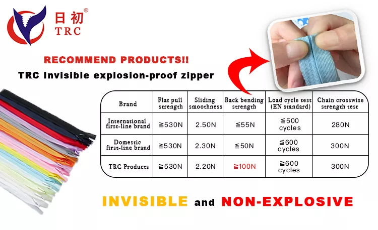 TRC Invisible Räjähdyssuojattu vetoketju (Normal Tape) yhdistää hienostuneen, hillityn ulkonäön ja poikkeuksellisen kestävyyden. Jokainen vetoketju on valmistettu tiukasti kudotusta polyesteriteipistä ja erittäin lujista nailonhampaista, mikä varmistaa sileän ja tasaisen sulkemisen, joka pysyy täydellisesti piilossa vaatteiden sisällä.