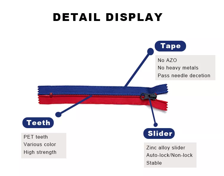TRC-nylon-lukitusvetoketju yhdistää korkealaatuisen nailonvetoketjun teipin tukeviin polyesterihampaisiin, mikä tekee tuotteesta sekä kestävän että tasaisen käytön, mutta mahdollistaa myös minkä tahansa kahden saman mallin vetoketjun helpon liittämisen (väristä tai erästä riippumatta), mikä tarjoaa käyttäjille joustavan ja kätevän käyttökokemuksen.
