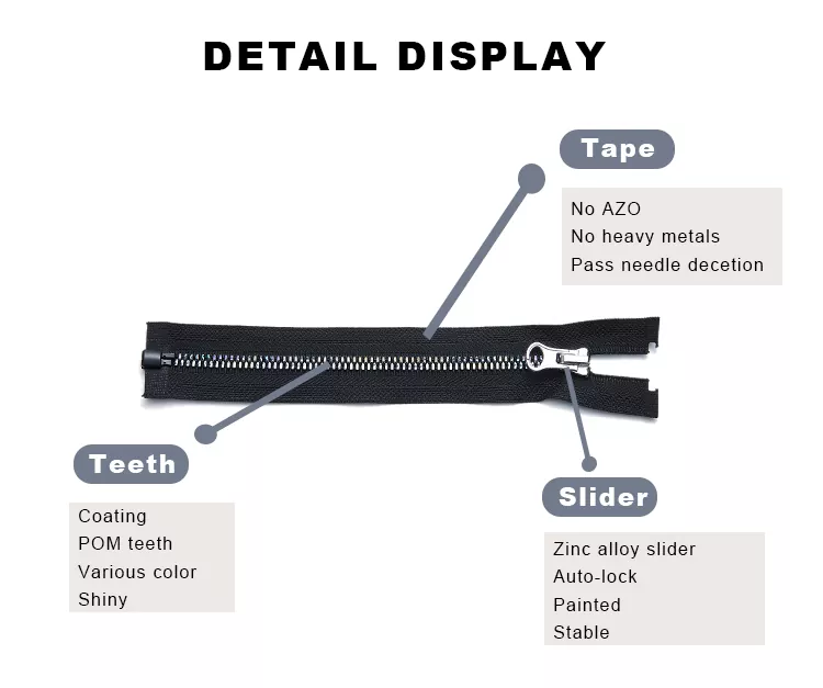 TRC-muovipäällysteiset vetoketjut ovat saaneet inspiraationsa tavallisten muovivetoketjujen vankasta rakenteesta, ja niissä on tarkka pinnoitusprosessi, joka antaa jokaiselle hampaalle tasaisemman ja kompaktimman pinnan. Tämä pinnoite ei ainoastaan paranna liuku- ja kulutuskestävyyttä, vaan tarjoaa myös lisäsuojaa hapettumista ja kosteutta vastaan. Tämän seurauksena TRC-muovilla päällystetyt vetoketjut toimivat vaivattomasti ja säilyttävät sileän pintansa ja lujuutensa myös toistuvan käytön jälkeen. Pinnoitteen heijastava kiilto antaa TRC-muovipäällysteisille vetoketjuille ainutlaatuisen ulkonäön tasapainottaen toiminnallisuuden ja tyylin. Niitä käytetään laajalti päällysvaatteissa, urheiluvaatteissa, matkatavaroissa ja muissa sovelluksissa.