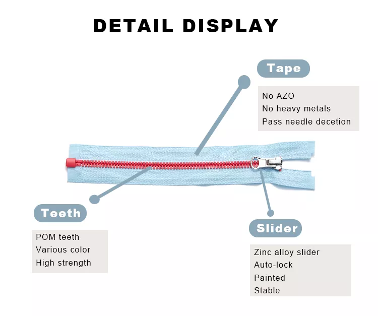 TRC-standardin muovivetoketju on ruiskuvalettu polyoksimetyleenistä tai muista erittäin lujista hartsimateriaaleista, mikä varmistaa hampaiden hyvän muodostumisen ja tarjoaa erinomaisen sileyden ja erinomaisen kulutuskestävyyden käytön aikana. Niiden pinnat tukevat erilaisia värikäsittelyjä erinomaisella värinkestolla, jolloin värit pysyvät eloisina pitkään. Lisäksi yhdistettynä erittäin lujaan polyesteriteippiin kokonaisrakenne on tukevampi ja kestävämpi, mikä täyttää toistuvan päivittäisen käytön vaatimukset.